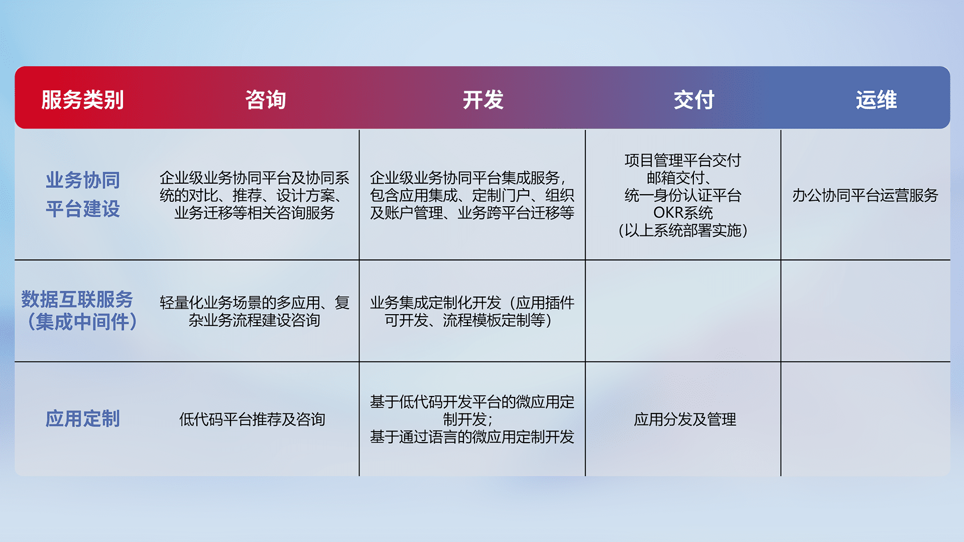 针对钉钉、、企微、、、、IDaas等平台级产品提供产品的规划、、、、方案、、、交付、、、定制化开发等服务,,实现如统一协同办公、、、智能客户服务、、、混合会议管理、、、智能数据查询、、、等业务场景,,实现数字化转型。。。。